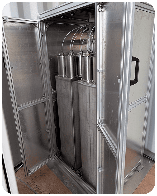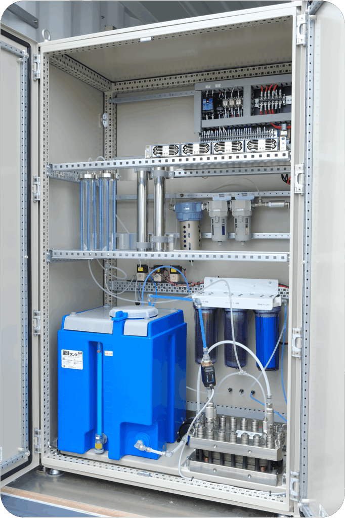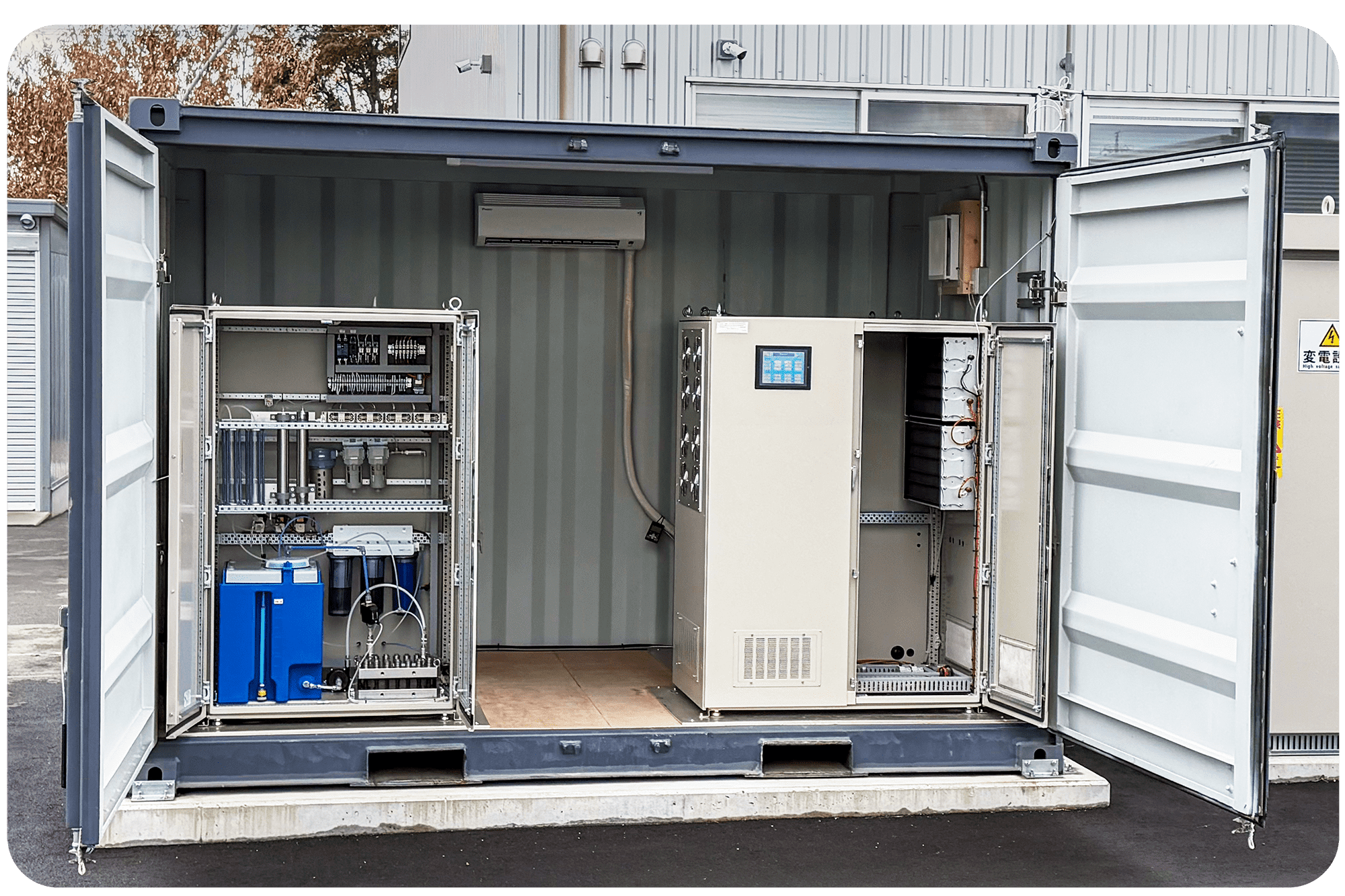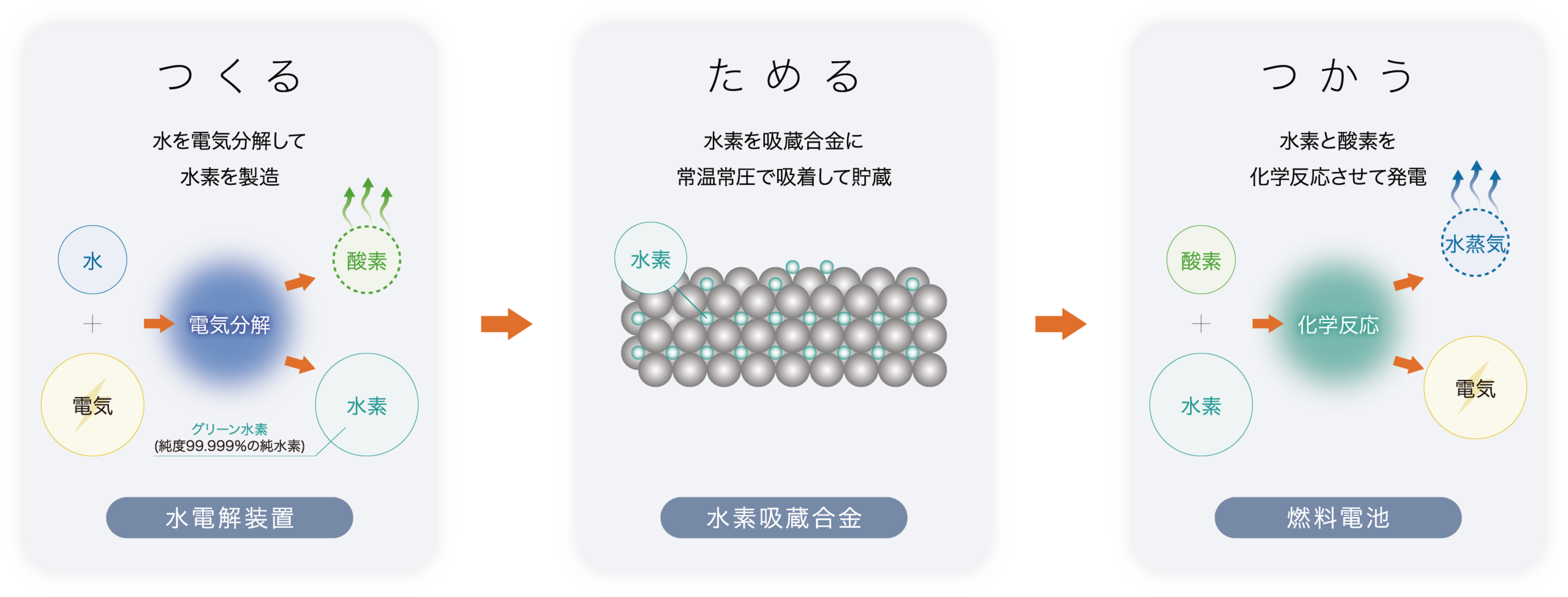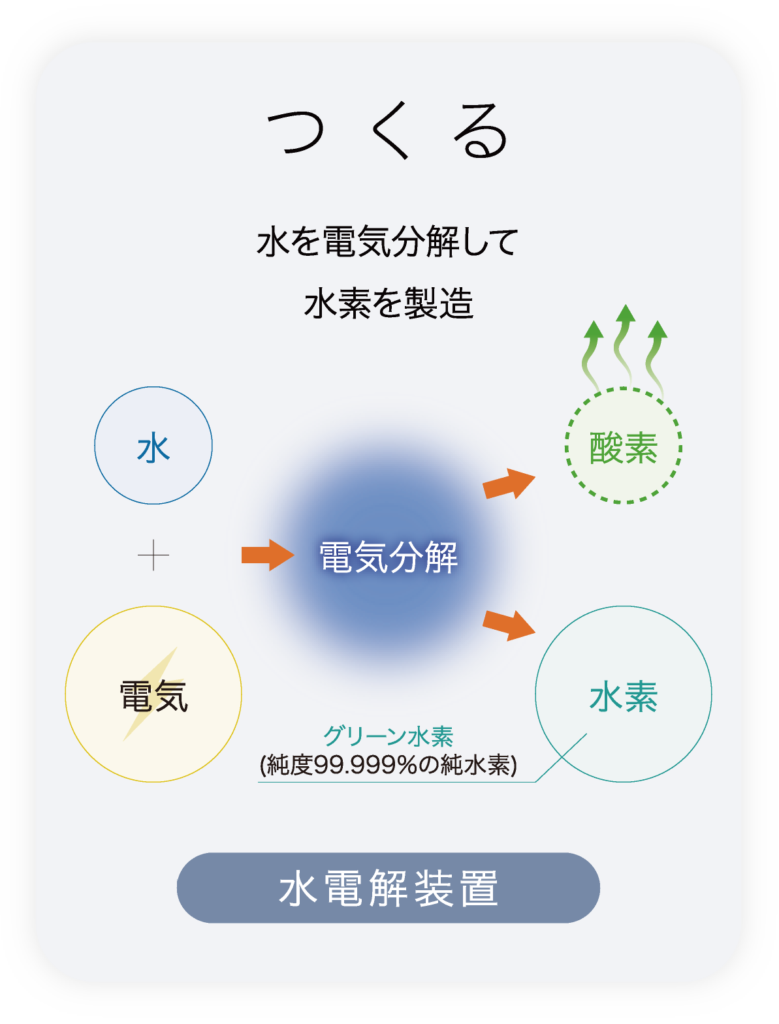 「つくる」「ためる」「つかう」を一つのパッケージにまとめ、EMSを内蔵したグリーン水素発生・循環システムです。小型分散型のグリーン水素発生装置から大型水素製造プラントまで、幅広い用途で使用できます。