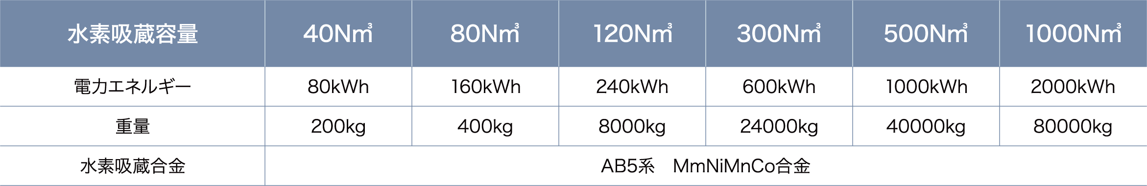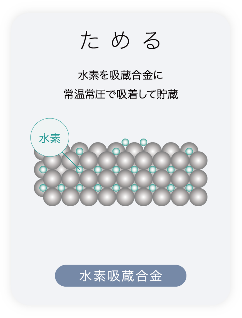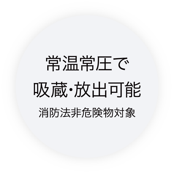 常温常圧で水素吸蔵合金に貯蔵することが可能。体積当たりの水素貯蔵量は多く、安全性の面でも非常に高い評価です。
